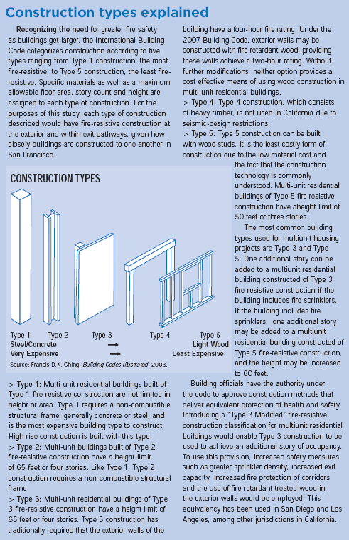 The Building Code requires relatively onerous measures if a builder wants to add a residential story to the typical four-over-one configuration described above. Again, other jurisdictions, namely San Diego and Seattle, have adopted code standards to make an additional story of wood-frame construction feasible while maintaining the equivalent fire and life safety (see the modification to Type 3 construction recommended below).