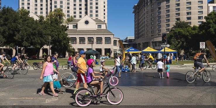 Today, Peñalosa explained, Olmstead’s vision is inspiring a new kind of community gathering in cities worldwide: Ciclovía, literally “bike path” in Spanish. This ground-breaking weekly event, started in Bogotá, Colombia, draws more than 1.5 million people around the world to walk, bike, skate and enjoy more than 70 miles of streets opened to people — and closed to automobile traffic. Founded in 1976, Ciclovía started small and grew in the ’90s under the mayorship of Gil’s brother, Enrique Peñalosa. (Gil, was Bogotá’s parks director at the time.) Thirty years later, the concept has spread everywhere from Tokyo, Japan to Kiev, Ukraine. San Jose adopted the concept with its annual Viva Calle event, started in 2015. Peñalosa challenged leaders to build on the success of Viva Calle and take the commitment to the next level by closing the streets to cars weekly.