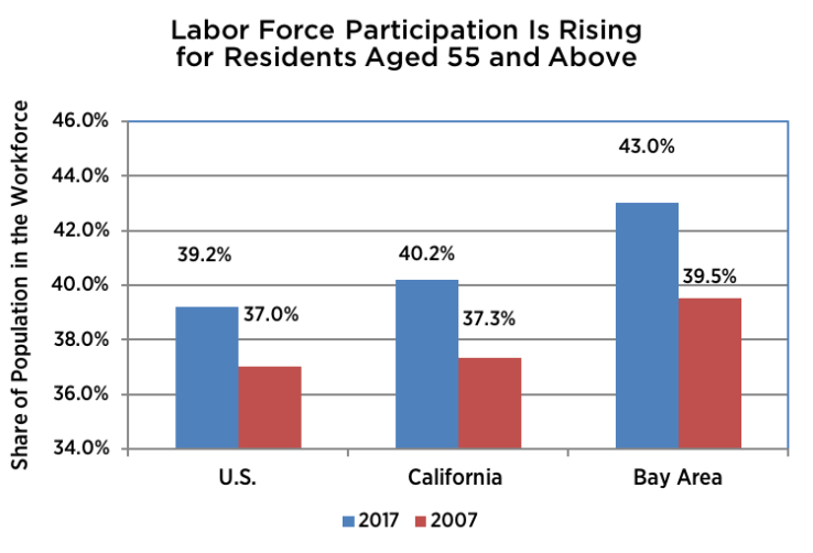 The results reveal two trends. First, labor force participation rates fall sharply after age 55 even after accounting for older workers working longer. Second, the Bay Area population is aging, and a large share of regional growth to 2030 is in residents 55 and older. Retirements may be delayed, but they do happen eventually. The first chart below shows that labor force participation rates for older workers have increased in the nation, state and region, a trend expected to continue.