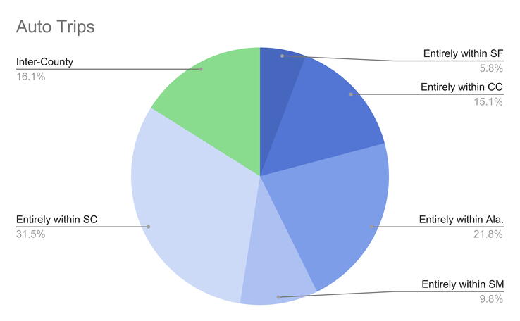 Replica’s data show that, on a typical weekday in fall 2024, some 5.52 million people traveled within the five-county subregion of the Bay Area, making a cumulative 23.8 million one-way trips. SPUR broke the data down by purpose — including going home, to school, and to work — and by travel mode — including by private car, public transit, walking, and cycling. Of these trips, a total of 16.4% involved travel between counties.