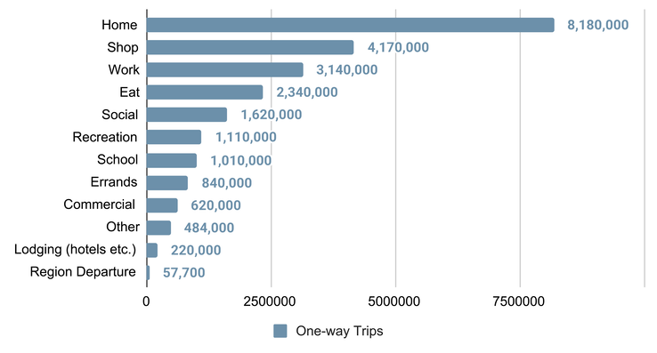 On a typical fall 2024 weekday, 23.8 million one-way trips are made in Alameda, Contra Costa, San Francisco, San Mateo, and Santa Clara counties, seen here broken down by trip purpose.